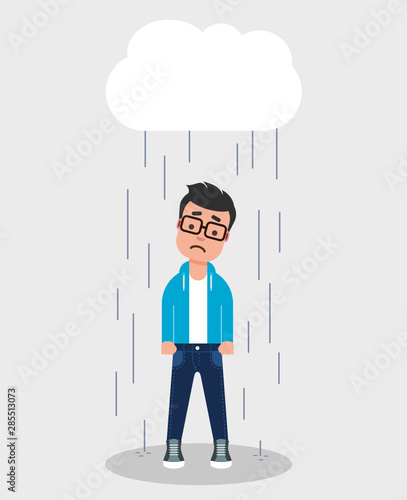 Young Man In Jeans And Sneakers Standing In The Rain Bad Day Concept Sad Boy Looking Disappointed Unhappy Teenager Under A Rainy Cloud Vector Illustration Flat Style Clip Art Buy This