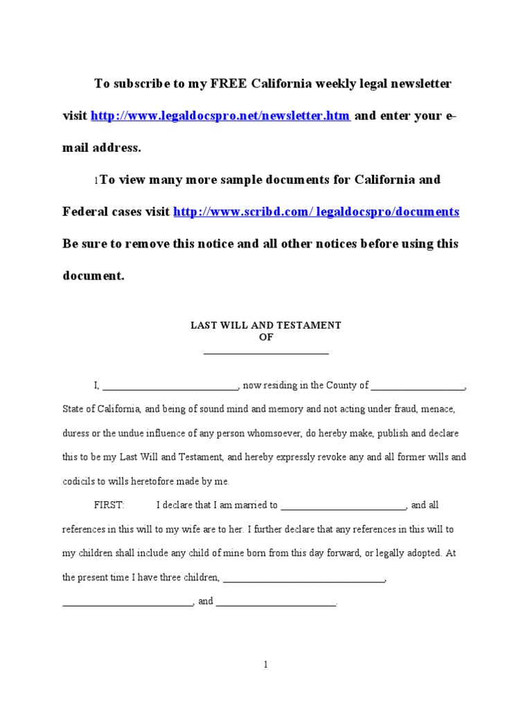 The california last will and testament is a legal document that s used for the purpose of distributing an individual s property whether it s personal or real estate upon their death to those they would like to receive it. The last will and testament is a document that is created by the grantor to show how his wealth and property will be distributed when he dies. This person is called a personal representative or executor. The ez online forms takes all the guess work out of which information goes on what line.